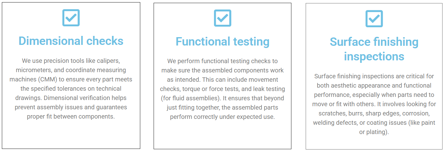 All parts executed are individually inspected and tested after each stage of the manufacturing process to ensure compliance and safety. The checks we provide: dimensional verification, functional testing, and surface finishing inspections. On request, the parts can be delivered with control file sheets. Assemblies are checked and tested after the final assembly stage.
